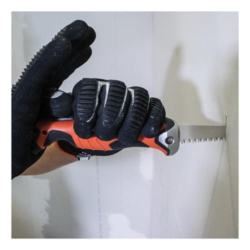 Jab saws can rip or tear your tool bag. With Klein Tools folding jab saw, there's no need for taped-up, homemade sheaths or big holes in your tool pouch. The fast cutting carbon steel blade is as sturdy as a fixed blade saw, but folds smartly into the comfort grip handle. The lockback mechanism secures the blade at a full 180 deg and also at a 125 deg for those hard to reach spots.