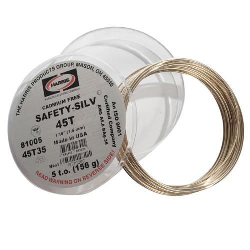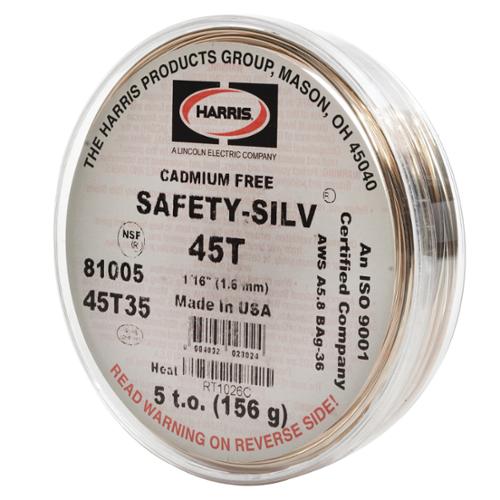 Safety-Silv® 45T performs like a 45% silver, cadmium-bearing alloy, but is cadmium-free. It has a lower melting temperature than Safety-Silv® 45. This alloy has excellent fillet-forming qualities. Safety-Silv® 45T produces high-strength, ductile joints. It is NSF 51 certified for use with foodservice equipment.