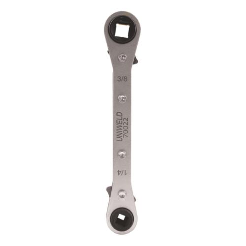 Uniweld's 70022 is designed for use on compressor access valves and Acetylene B/MC tank valves. 70074 and 70075 Double-end Reversible Ratchet Wrenches has an offset design for knuckle clearance in confined work spaces.