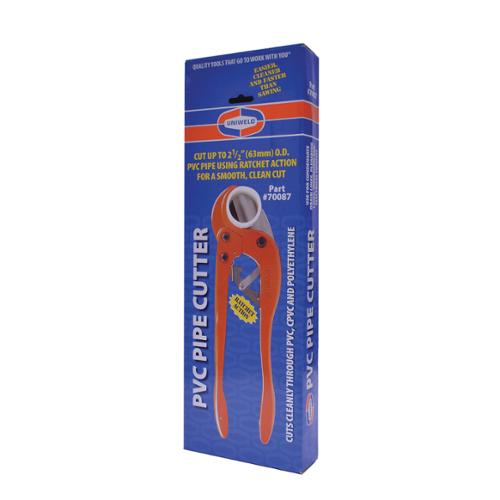 Uniweld's PVC Pipe Cutters are the ideal cutting tools for plastic pipe commonly used for condensate drain line, plumbing lines, irrigation and electrical conduit. Easy-to-use ratchet-action mechanism and hardened steel blade replaces that old saw blade that never cut clean or straight. The blade holds a sharp edge and is easily field replaceable. Cuts cleanly through all plastic piple including: PVC, CPVC and Polyethylene.