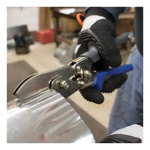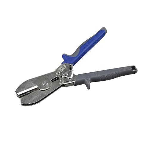 The 5-Blade Crimper from Klein Tools produces factory-precision indentations in stove pipe and round duct with just a squeeze. Compound-leverage mechanism makes precise indentations on 24 gauge steel and 28 gauge stainless steel. The 5-Blade Crimper features comfortable, contoured grips that cover hardened steel handles and a convenient self-opening tool latch for one handed operation. The all steel construction with nickel plating provides long life and durability.