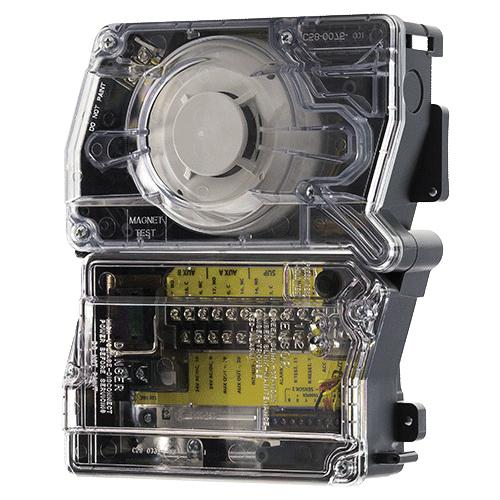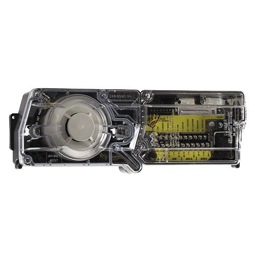 The InnovairFlex D4120 4-wire photoelectric duct smoke detector features a pivoting housing that fits both square and rectangular footprints and mounts to round or rectangular ductwork. This unit senses smoke in the most challenging conditions, operating in airflow speeds of 100 - 4000 fpm, temperatures of -4 to 158 deg F and a humidity range of 0 to 95% (non-condensing). A plug-in sensor head offers improved false alarm immunity and simple installation, testing and maintenance. An improved cover design isolates the sensor head from the low-flow feature for simple maintenance. The InnovairFlex housing provides ample wiring space, a 3/4 in conduit knockout and built-in short circuit protection to prevent damage to sensitive components during installation. High contrast terminal designations make wiring easy. With its 2:1 sensor-to-power capability, the power board of the D4120 may be used to monitor a second sensor, D4S, simultaneously (i.e., supply and return side). As many as 50 InnovairFlex detectors can be interconnected. When one unit senses smoke, all interconnected detectors will switch their relays; only the detector sensing smoke will go into alarm, thus pinpointing the fire source. An easy-access test/reset button makes it possible to test the unit with the cover on. Three DIP switches can be used to configure field selectable settings: cover tamper delay, number of sensors to be controlled and shut down on trouble option. Each power board has 2 LEDs that can be used to indicate the status of connected sensors and a quick reference imprinted on the cover explains the LED status indications (standby, maintenance, trouble and alarm). The InnovairFlex duct smoke detector can be customized to meet local codes and specifications without additional wiring. The new InnovairFlex product line is compatible with all previous Innovair models, including remote test accessories.