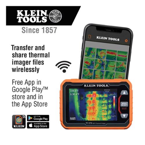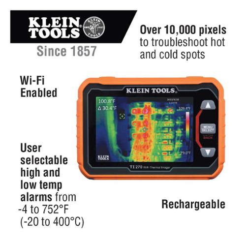 The Klein Tools TI270 is a high resolution, Wi-Fi enabled, USB rechargeable Thermal Imager. The large LCD displays unseen hot and cold spots for instant troubleshooting. Excellent resolution with over 10,000 pixels and your choice of three color palettes. The meter provides high and low temperature points, crosshairs to pinpoint specific temperatures and options for temperature alarms. App is available for free in Google Play™ store and in the App Store.